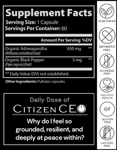 Ingredients: Organic Ashwagandha (Withania somnifera)(root), Organic Black Pepper (Piper nigrum)(fruit), pullulan capsules.