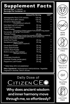 Ashwagandha Root (2.5% extract), Turmeric Root (95% extract), Cinnamon Bark Powder (Cinnamomum wilsonii), Holy Basil Leaf (2% extract), Garlic Bulb (1% extract), Trikatu Powder (black pepper fruit powder, long pepper fruit powder, ginger root powder), Triphala Powder (amla fruit powder [Phyllanthus emblica], bibhitaki fruit powder [Terminalia bellirica], haritaki fruit powder [Terminalia chebula]), Amla Fruit Powder, Sandalwood Wood Powder (Pterocarpus soyauxii), Cloves Bud Powder, Celery Seed Powder, Licorice Root Powder, Brahmi Leaves (20% extract) (Bacopa monnieri), Shilajit, Cordyceps (mycelium), Lavender Powder (whole plant), Peppermint Leaf Powder, Hydroxypropyl Methylcellulose, Vegetable Magnesium Stearate, Silicon Dioxide.